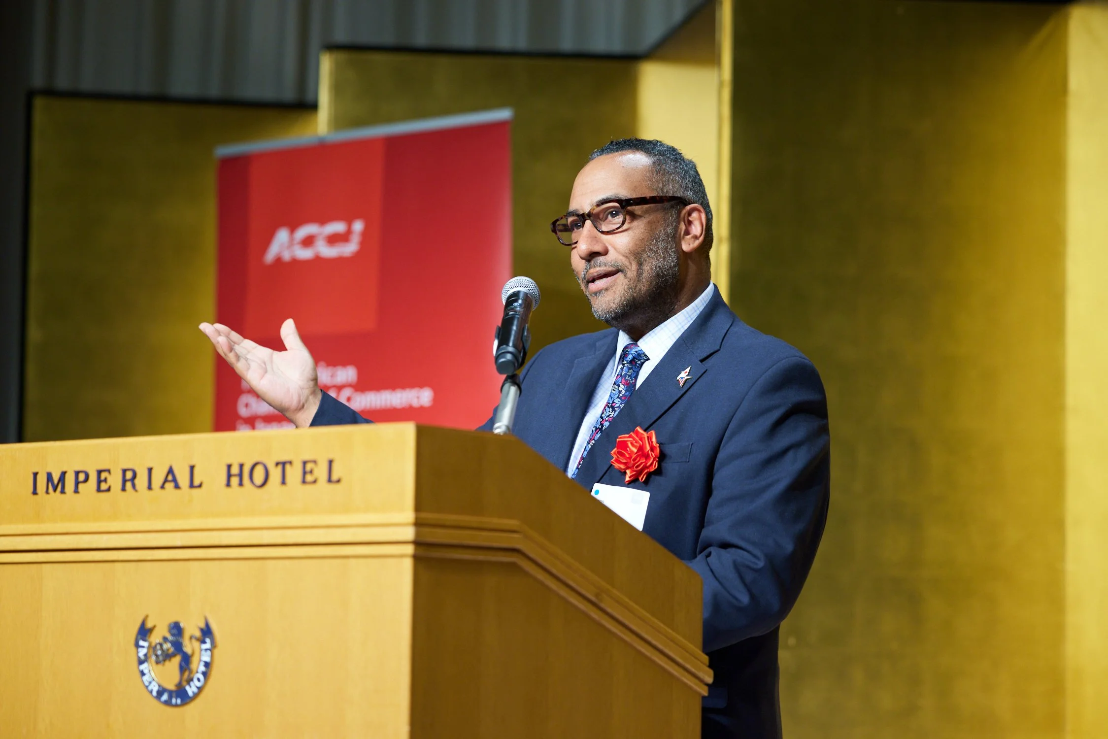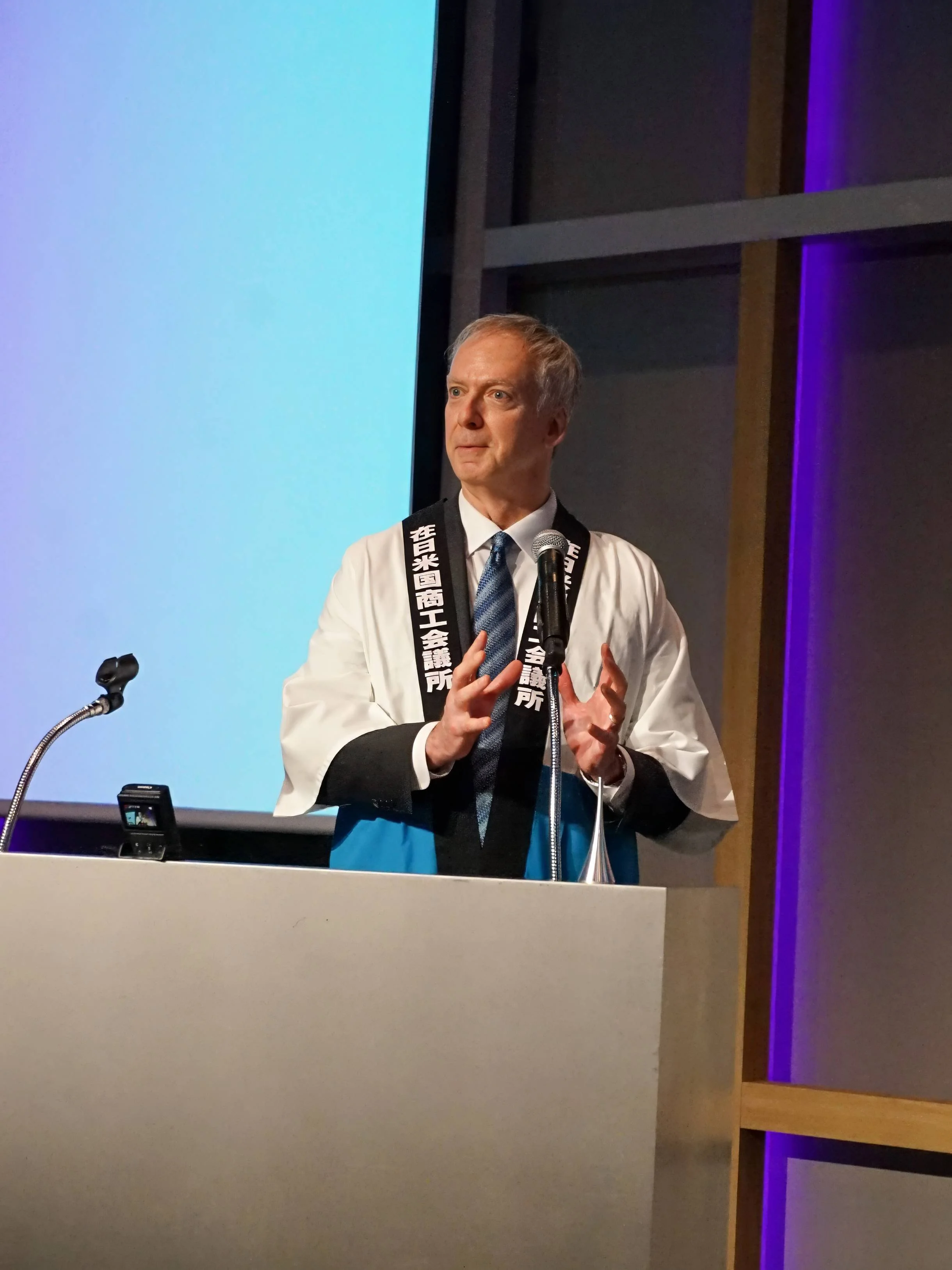 ACCJ President Victor Osumi took to the stage against a starry backdrop to welcome everyone to An Evening of Connection and Appreciation, a formal cocktail-style reception that brought together nearly 300 ACCJ members and guests.